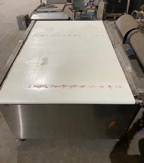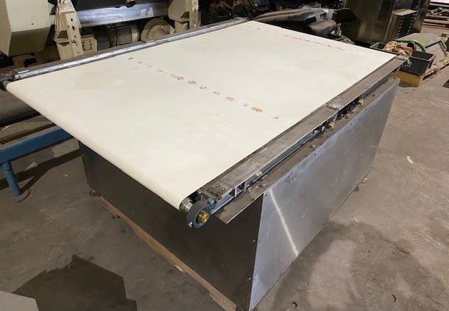 Stainless steel conveyor with food grade belt.Very slow speed. Approx 3 rpm .1kw geared drive. Belt Width 1100 Length 1800Height 945Ex food plant.