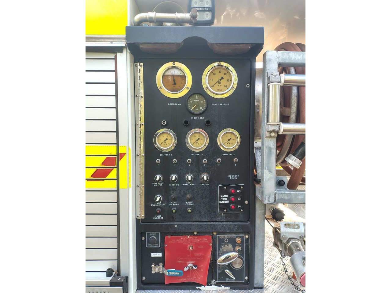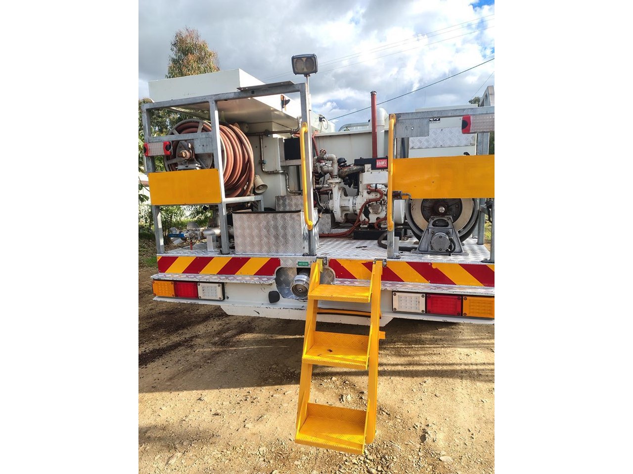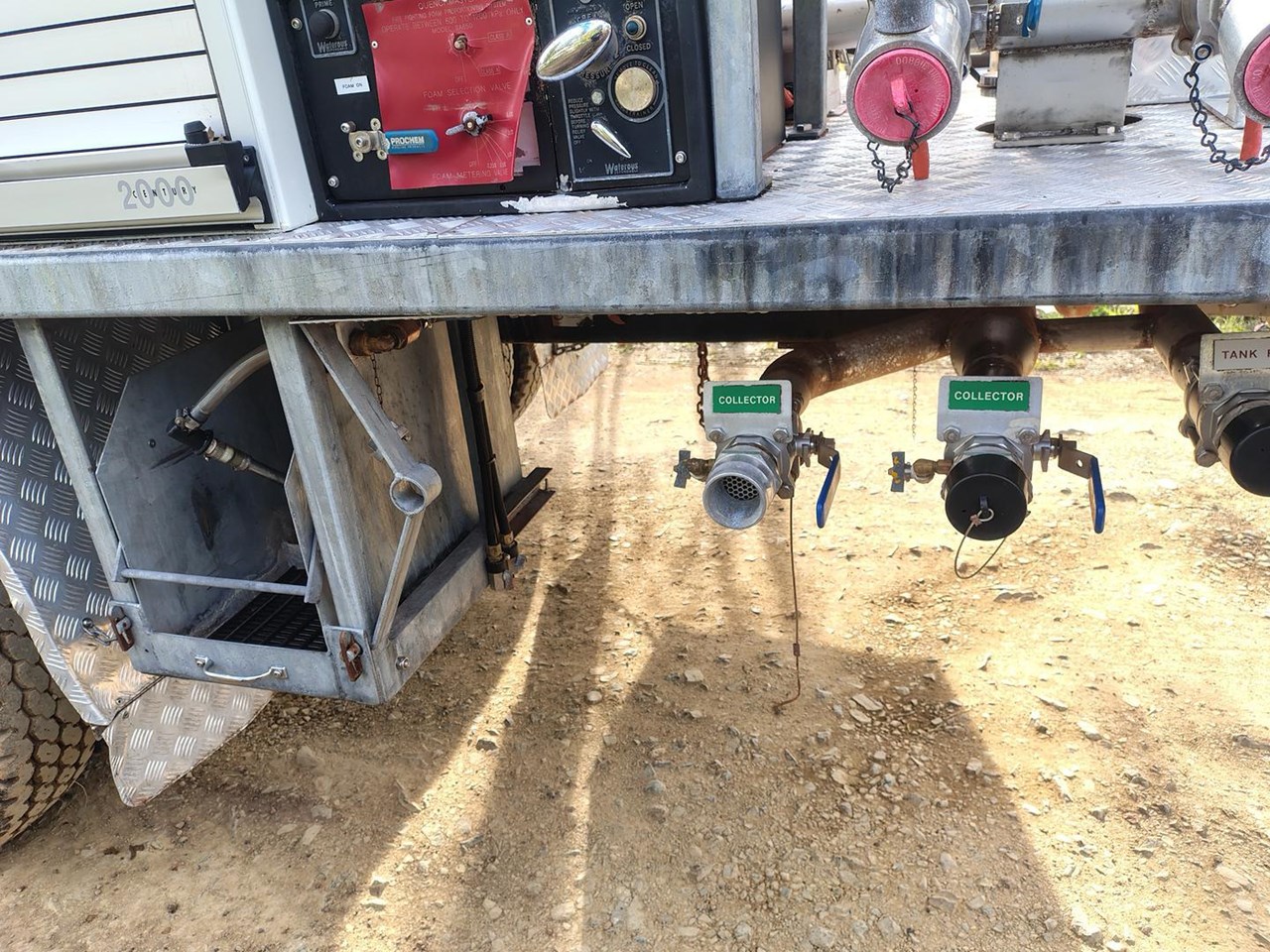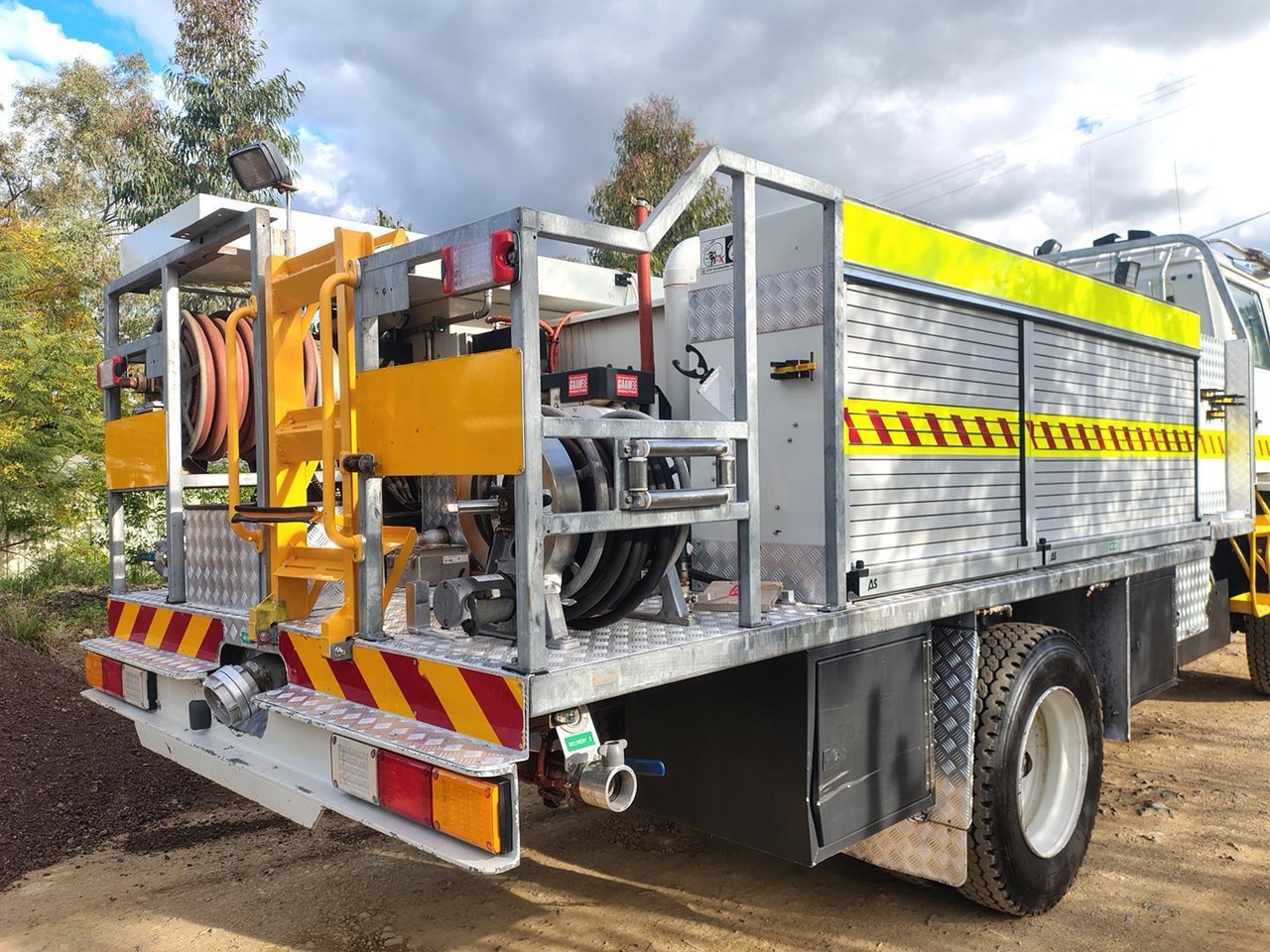 Truck and crew fire protection, auto rewind hose reels, foam application.