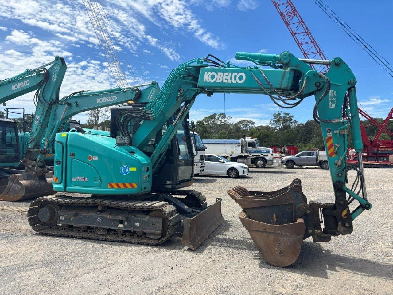 2021 Kobelco SK75SR-7 Excavator - Fitted With : Fully Enclosed Air Con Cab, Battery Isolator, Dual E-Stops, Internal Fire Extinguisher, 270 Degree Eagle Eye Camera, Hammer & Auger Piping, Quacker Motion Alarm, Tinted Windows & Reflective Tape, UHF Radio, Rubber Pads, Extra Counter Weight, 1500mm Mud Bucket, 600mm GP Bucket, 450mm GP Bucket., 300mm GP Bucket, 1112hrs On Machine