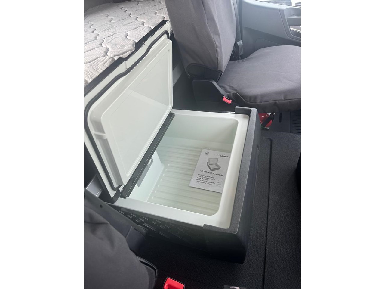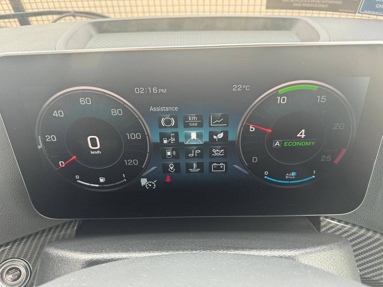 Cabin - Kerb mirror and main mirror, manoeuvring setting, co-driver's side - Driver and co-driver sunblind - Seat belt monitor - Air horns, cab roof - Air deflector, snap-in, with cab side deflectors - Sun visor exterior transparent with chrome highlight - TrendLine interior design with ambient lighting, chrome trim, carpet on engine tunnel - Leather steering wheel - Driver and co-driver air sprung comfort leather suspension seat - Luxury bed, bottom, inner spring - Luxury bed, top, wide, with levelling control - Multimedia Cockpit, interactive - Comfort telephony, wireless charging - Cruise control and speed limiter - Travel computer, on-board diagnosis and maintenance system - Truck navigation - DAB radio - Premium loudspeaker system with additional speakers - 24 V/15 A co-driver footwell sockets - Automatic climate control - Pull out tray table on passenger side - Stowage flap and compartments above windscreen - Stowage compartment exterior flap, left and right - Mercedes star, illuminated from behind in dark chrome - Dark chrome badging - Two 30 l pull-out refrigerators under bunk