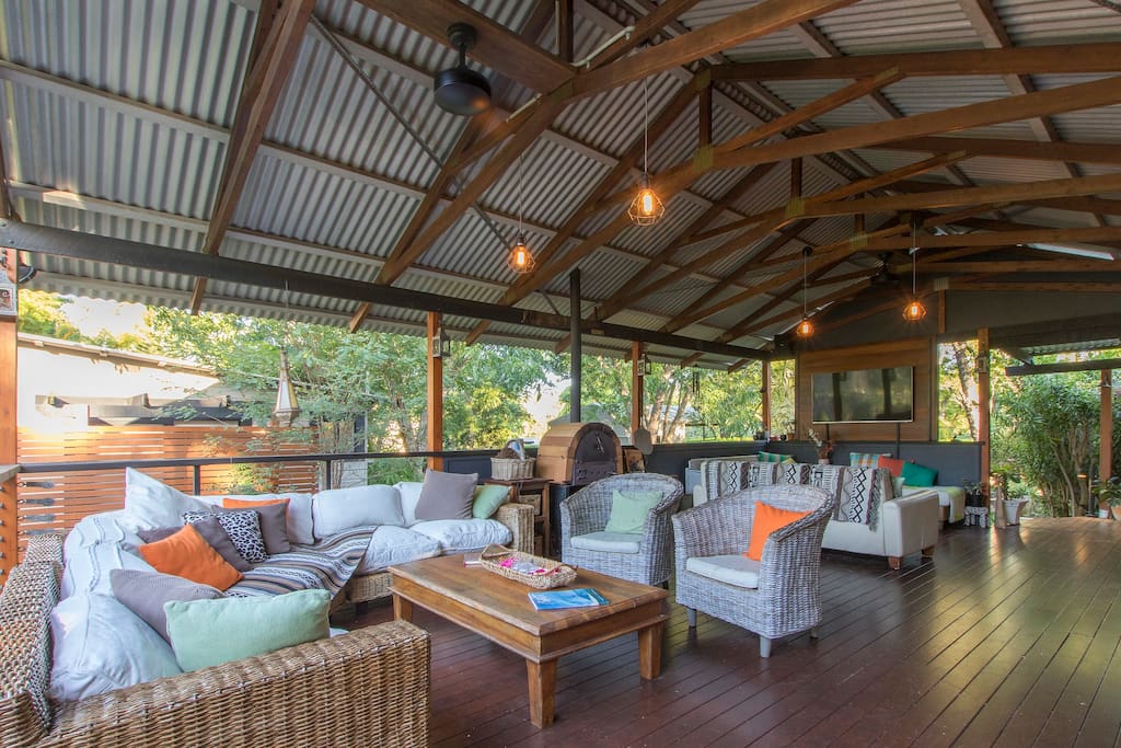 Complete with an outdoor spa, barbecue by the ponds, peaceful reading areas, wood-fired pizza oven, outdoor dining table under the stars and a huge outdoor verandah with comfy lounges for relaxing and watching movies.