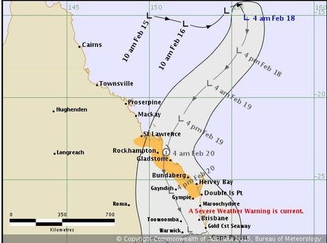 Bureau of Meteorology spokesman Jess Carey said it was likely the category one cyclone would cross the coast near Gladstone tonight, pushing high rainfall right down into South East Queensland with some areas expecting up to 500mm.
