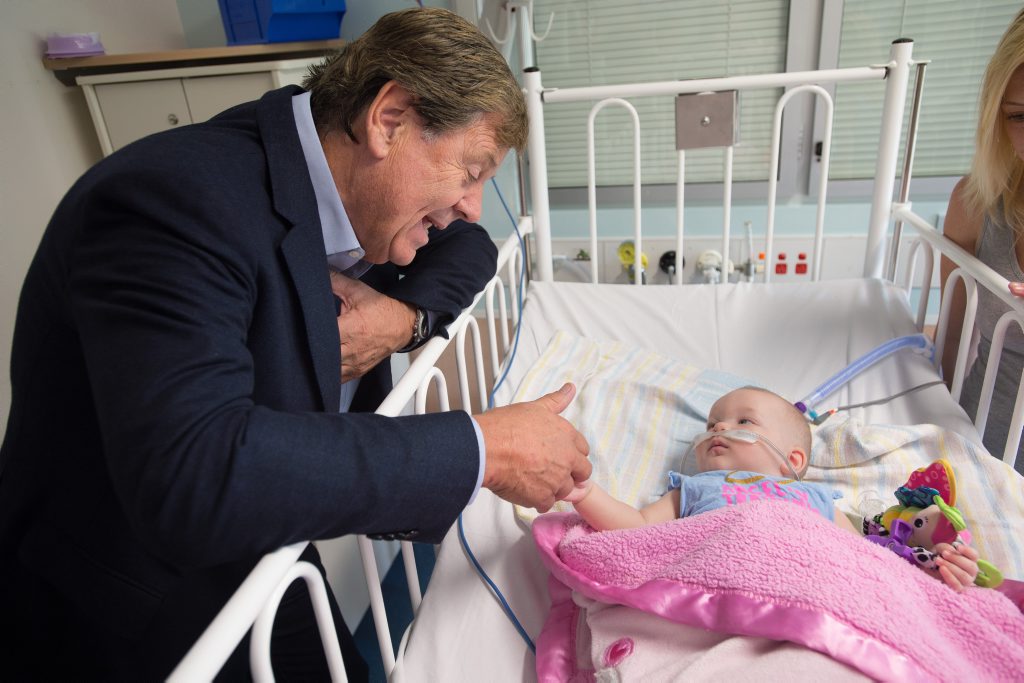 Hand in hand with great Australian, TV journalist and long-standing patron of the Humpty Dumpty Foundation Ray Martin, six-month-old Tanika, who suffers a respiratory condition, owes her life to medical equipment the charity has bought for the Coffs Harbour Health Campus.