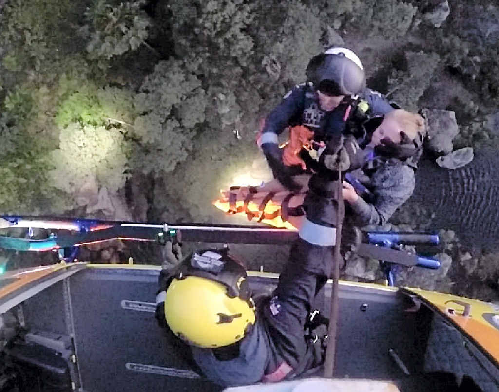 On dusk, the RACQ Capricorn Rescue Helicopter Service set off on the two-hour rescue mission to Rainbow Falls. A rescue crewman and intensive care paramedic were winched to the ground to treat the patient.